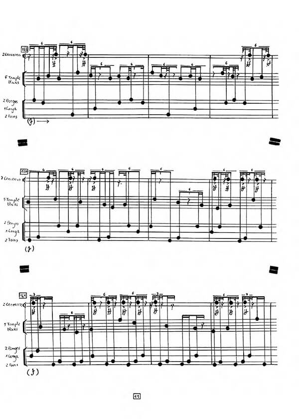 Des strates de timbres très identifiables (peaux, bois, métaux) sont superposées. Elles ont des processus rythmiques autonomes et constituent ainsi une sorte de structure clivée, divisée au sein de laquelle chaque strate entre en conflit avec les autres et tente d’imposer sa prédominance. Les dilatations et les contractions temporelles de chaque strate coexistent sans s’influencer réciproquement.
