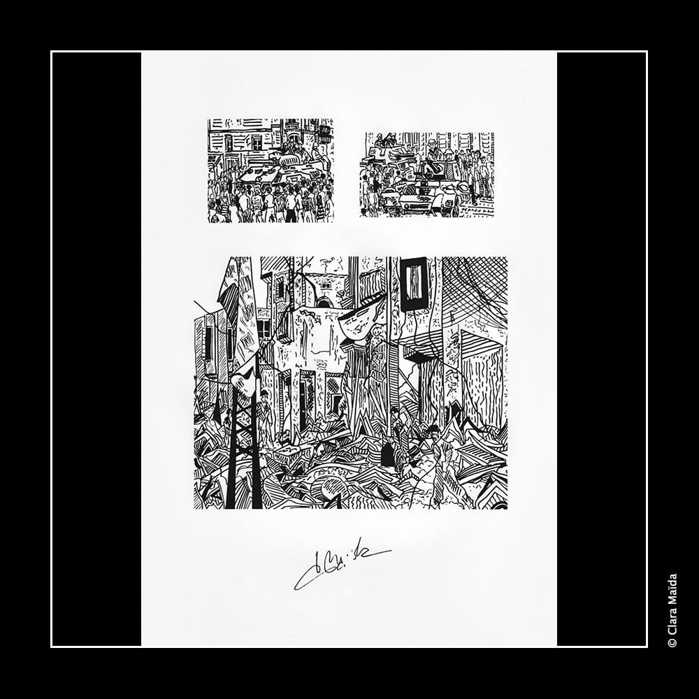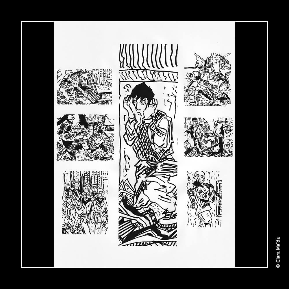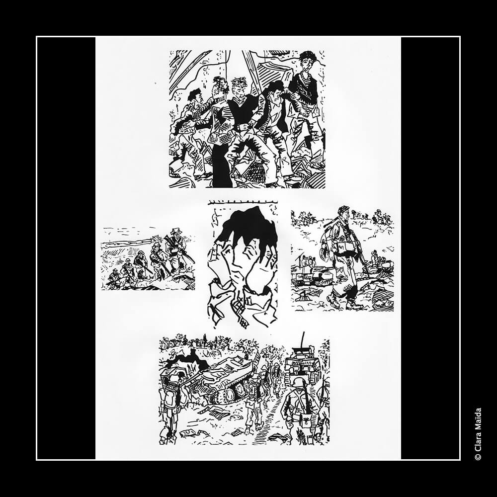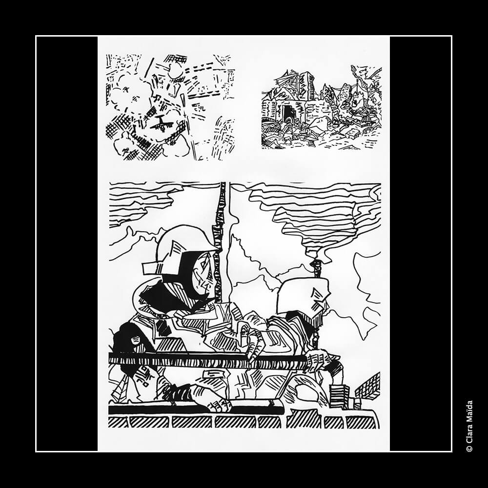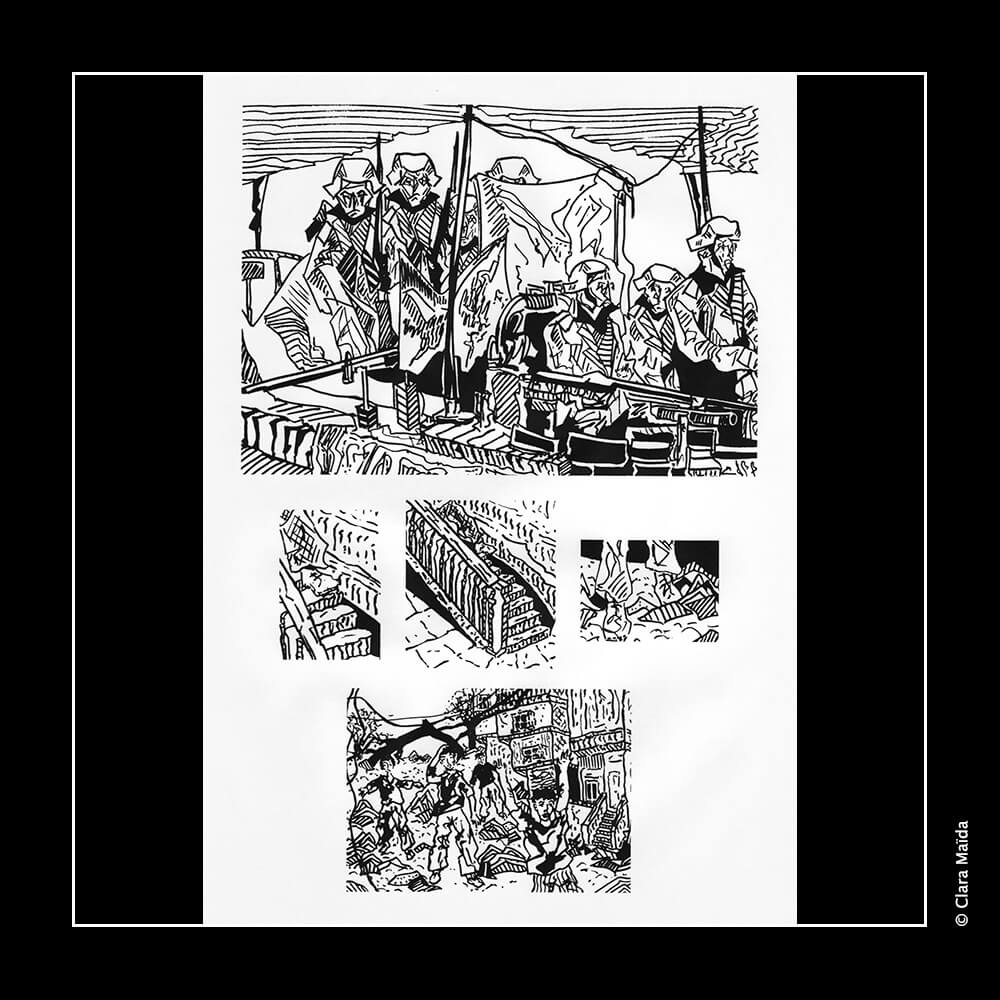 L'agencement des dessins retrace une mini-chronologie narrative sans paroles qui se place du côté de toutes les victimes des conflits : les populations bombardées, en premier lieu, mais aussi les soldats pris au pièce des idéologies.