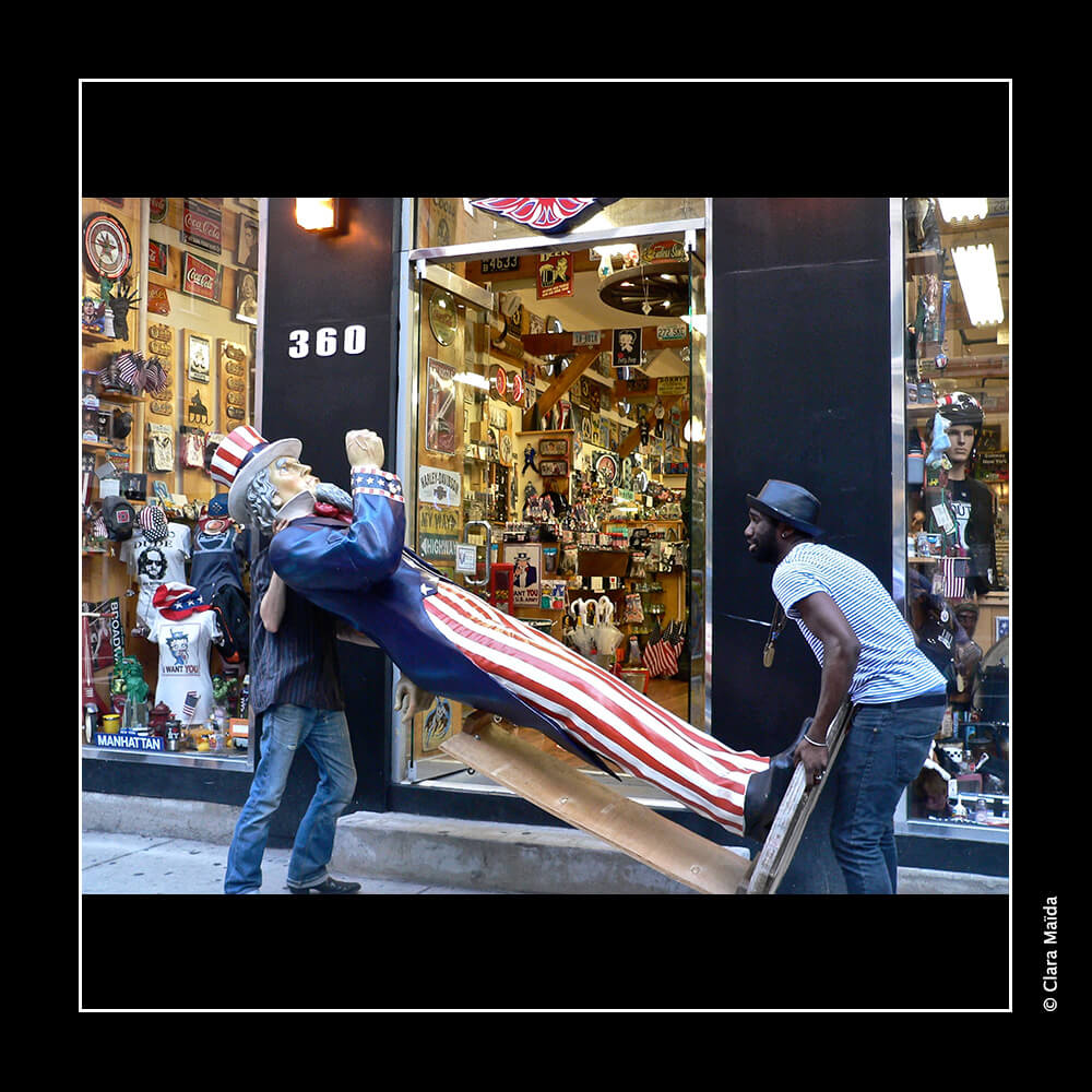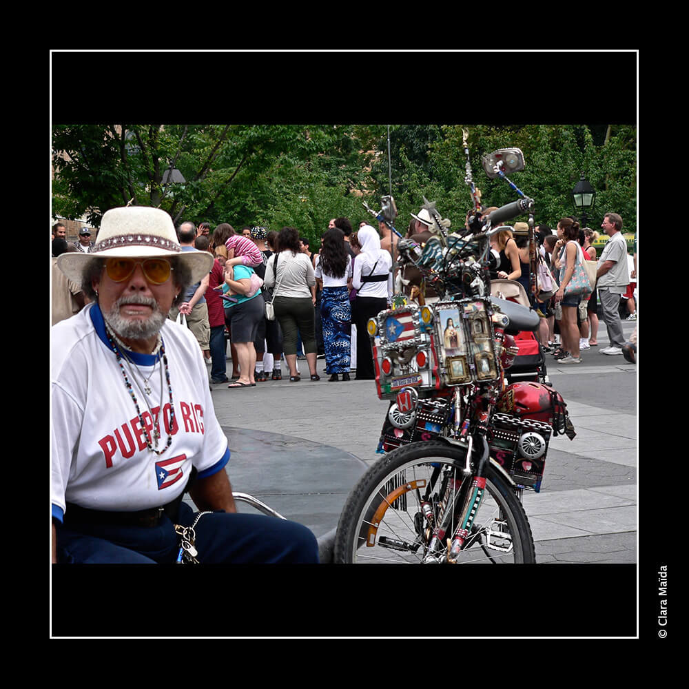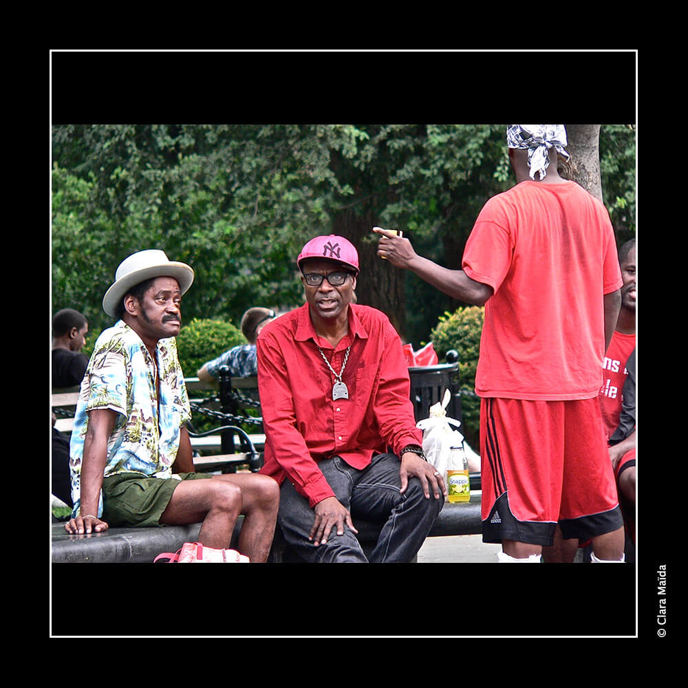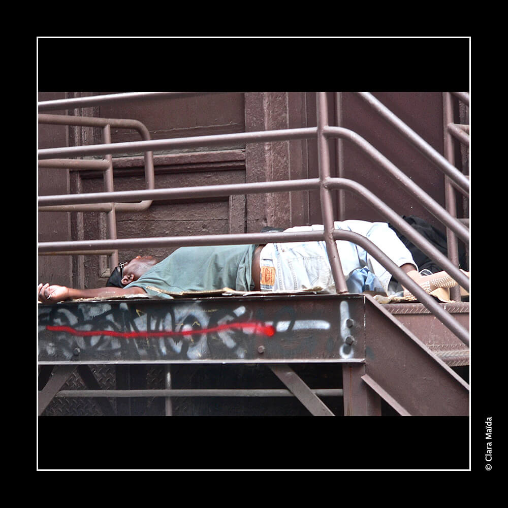 Toute une population diversifiée parcourt les rues de New York. J’ai cherché à capter des situations quotidiennes et le contexte politique et socio-économique qu’elles révélaient ici et là : des modes d’être alternatifs, la pauvreté et l’injustice sociale et économique, les temps d’expression d’une contestation ou les temps de détente dans les squares pendant l’été, les différentes communautés qui se côtoient dans la ville.