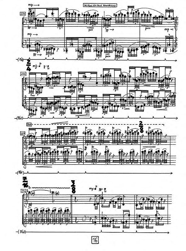 Cette structure déjà constituée d’une double face révèle, à l’issue de son parcours de mutation, une autre double structure constituée de petits motifs de trois sons, joués sur les cordes du piano, qui émergent de façon fugitive et fragmentaire pendant que de courtes courbes chromatiques commencent à apparaître. Cette sorte de structure cachée est progressivement dévoilée, ce qui induit une bascule vers une autre scène sonore que souligne son timbre généré par le jeu sur les cordes de l’instrument.