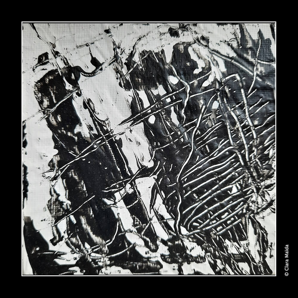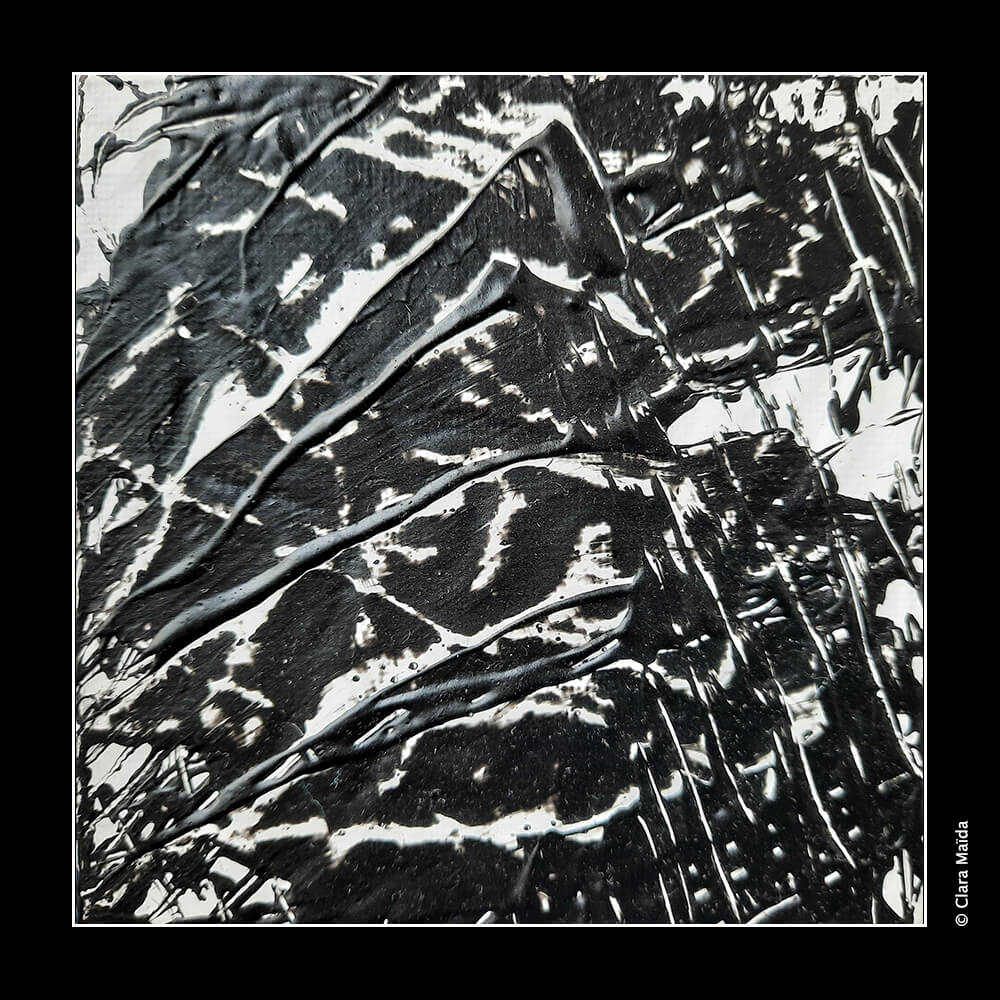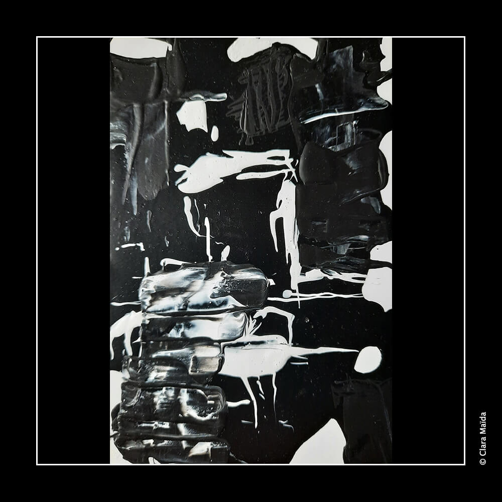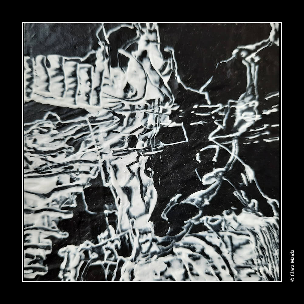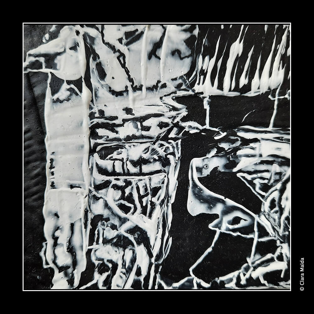 Gesso blanc ; pouring medium ; peintures acryliques (blanc, noir) ; couteau à peindre ; toile en coton 10x10cm (série 1 : peintures 1 à 4) et papier photographique 10x15cm (série 2 : peintures 5 à 7).