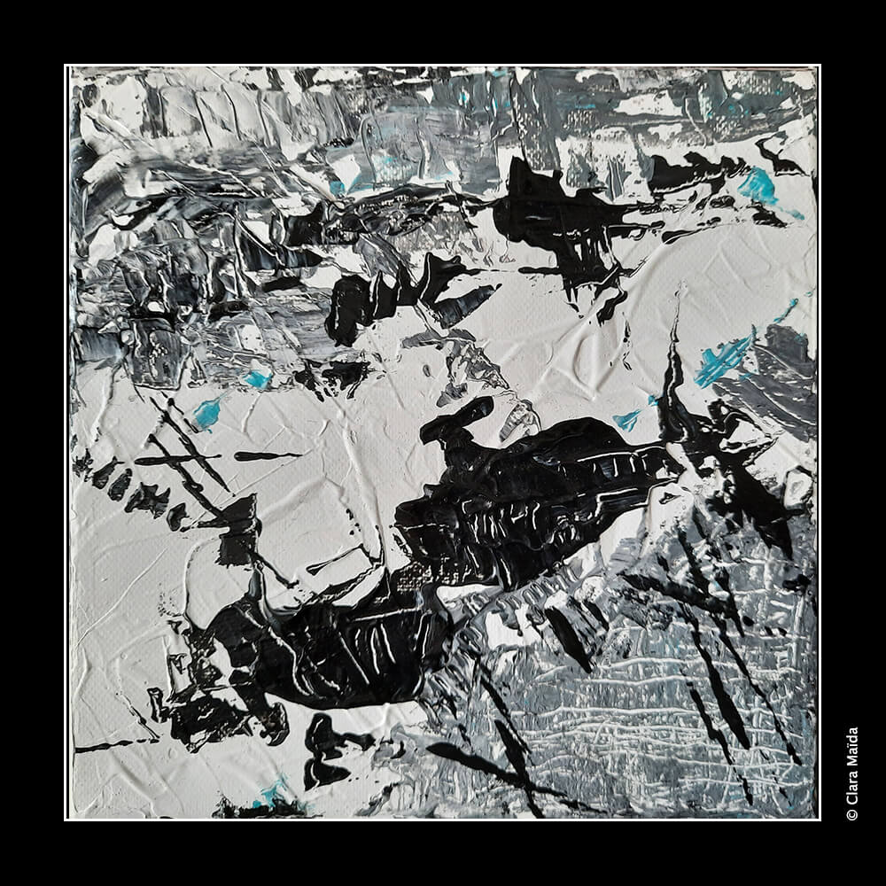 Gesso blanc ; pouring medium ; peintures acryliques (blanc, gris, bleu turquoise, noir) ; couteau à peindre ; toile en coton 20x20cm.