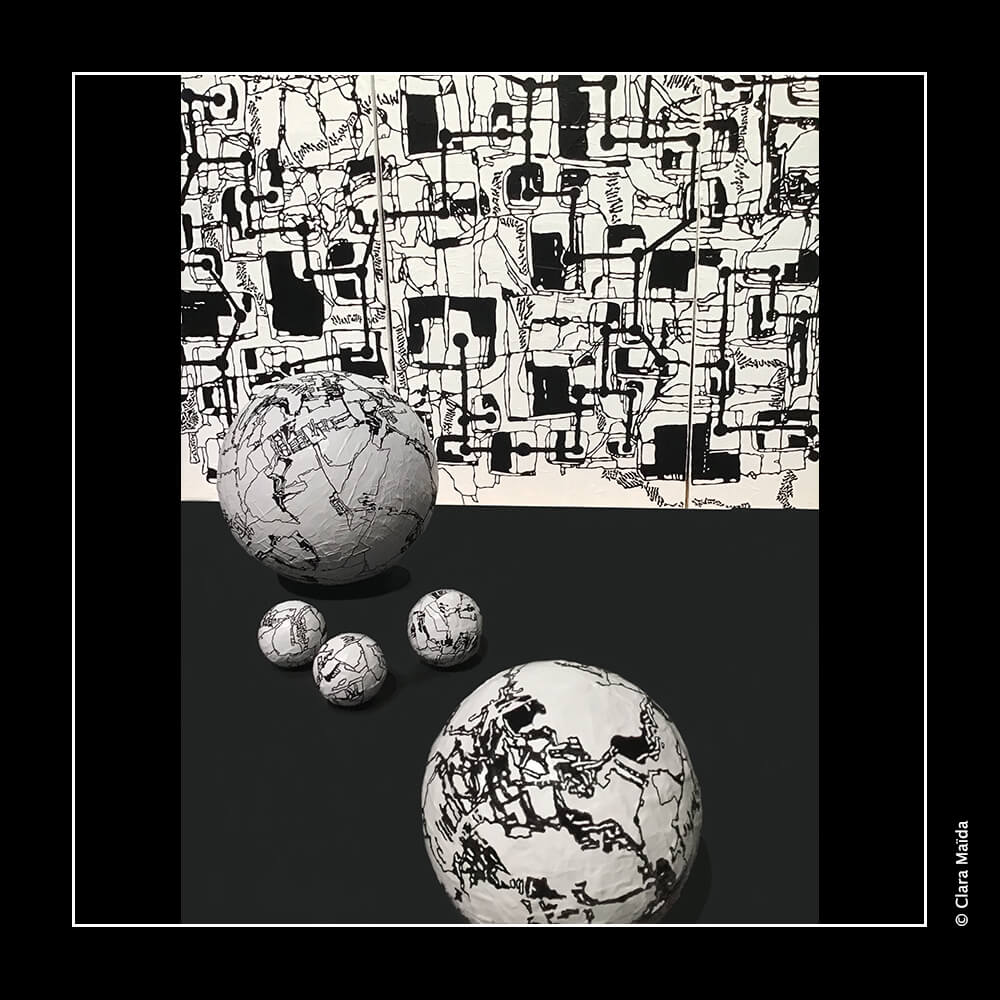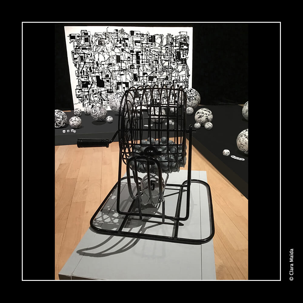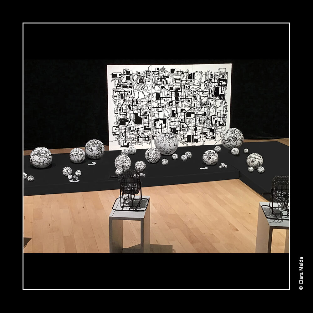 Gesso ; peintures acryliques (blanche, noire) ; couteaux à peindre ; marqueurs acryliques noirs ; triptyque de peintures (3 toiles en coton : 70x50 cm, 100x50 cm et 70x50cm) ; objets fabriqués : une trentaine de sphères de polystyrène peintes (diamètre variant de 10cm à 30cm) ; une dizaine de petits cubes en bois peints ; 5 machines à Bingo, avec boules de Bingo, posées sur des supports ; cartes de Bingo ; image projetée sur un écran (format 16/10) réalisée à partir d'un montage numérique de 13 dessins sur papier 80g A4 (collage de fragments d'adhésif de réparation toilé blanc ; marqueurs acryliques noirs).