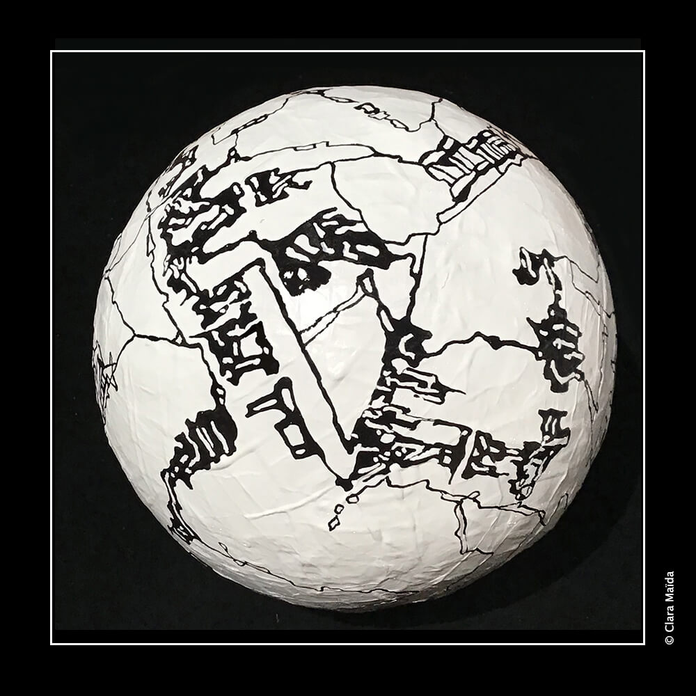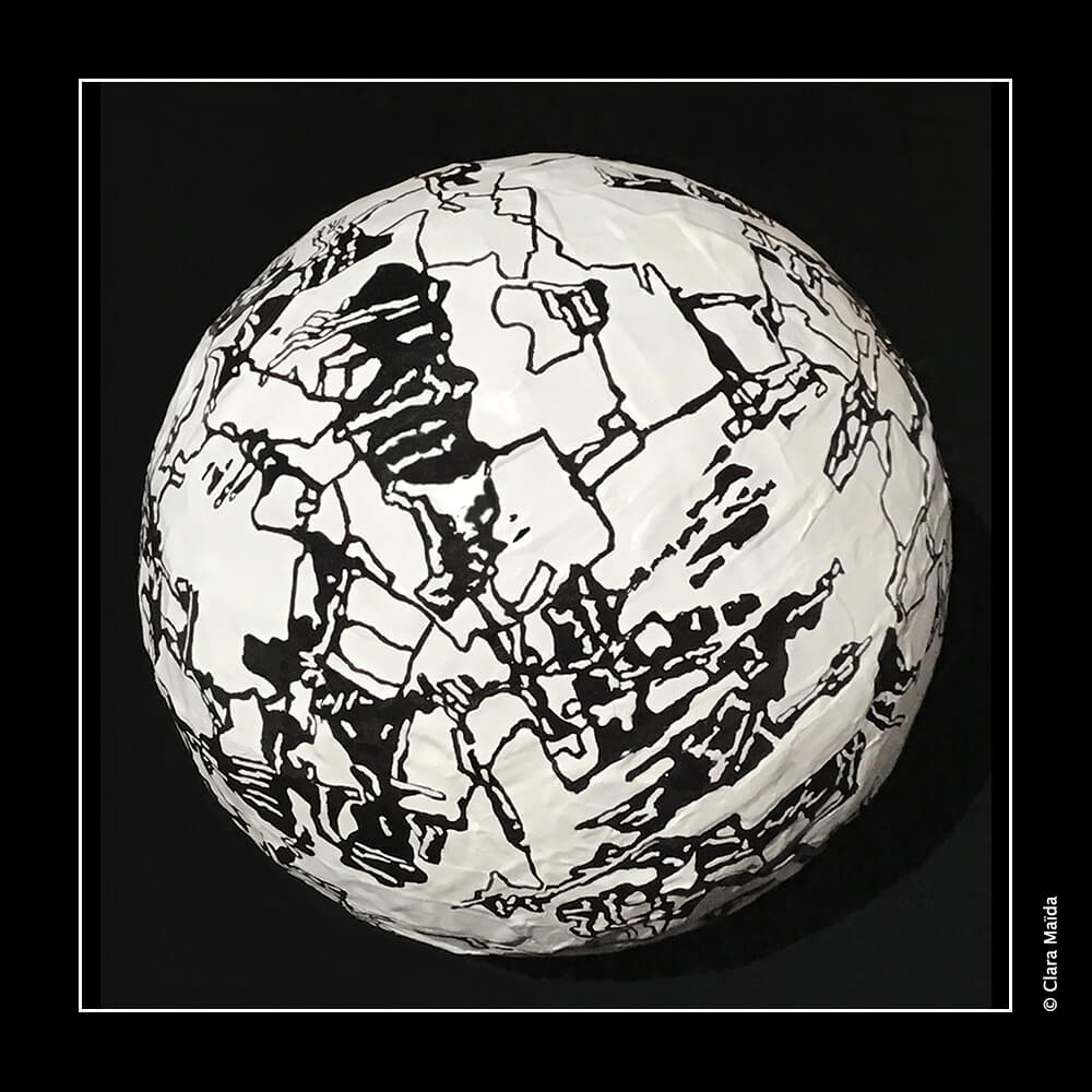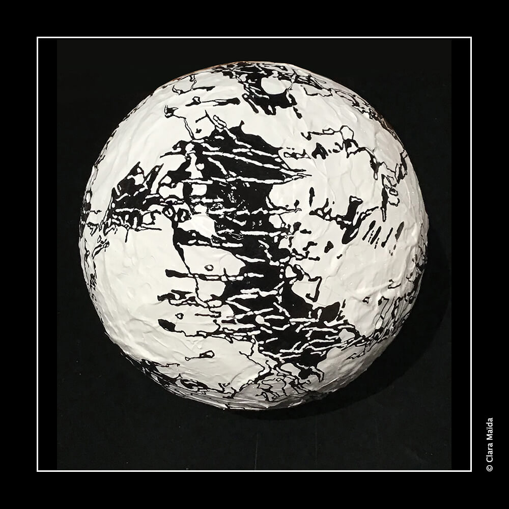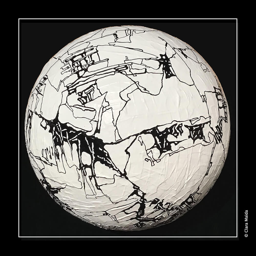 Gesso ; peintures acryliques (blanche, noire) ; couteaux à peindre ; marqueurs acryliques noirs ; triptyque de peintures (3 toiles en coton : 70x50 cm, 100x50 cm et 70x50cm) ; objets fabriqués : une trentaine de sphères de polystyrène peintes (diamètre variant de 10cm à 30cm) ; une dizaine de petits cubes en bois peints ; 5 machines à Bingo, avec boules de Bingo, posées sur des supports ; cartes de Bingo ; image projetée sur un écran (format 16/10) réalisée à partir d'un montage numérique de 13 dessins sur papier 80g A4 (collage de fragments d'adhésif de réparation toilé blanc ; marqueurs acryliques noirs).