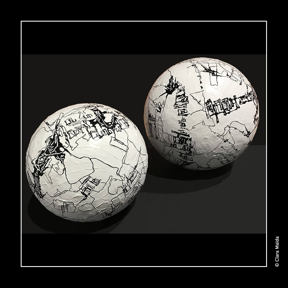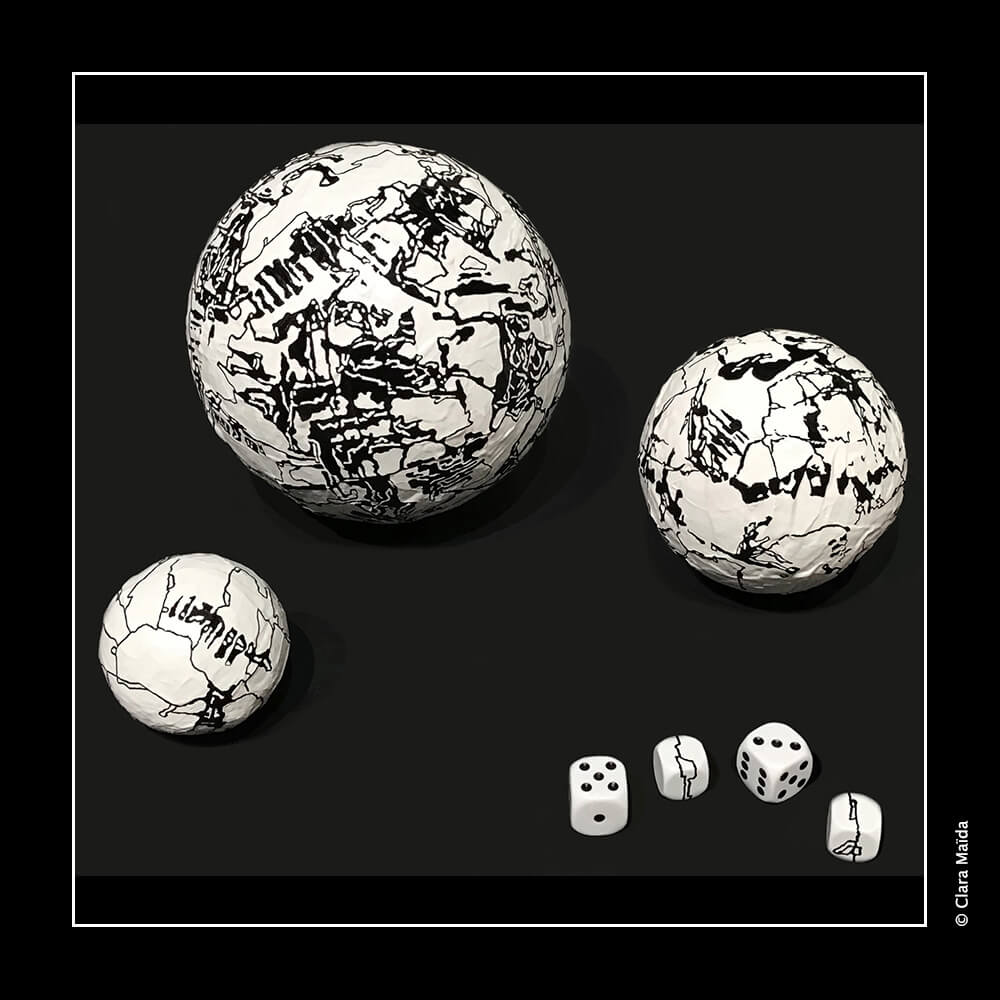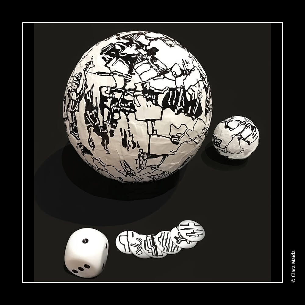Des objets réels (cinq mini-sphères de loto) sont disposés sur des présentoirs cubiques. Des objets fabriqués (sphères de tailles diverses, petits cubes) comportent le même type de graphisme abstrait noir et blanc que la machinerie et créent une connexion entre les objets se référant au jeu (boules de loto, dés à jouer) et l’image projetée. Ils semblent être les débris rejetés par un système à la mécanique inflexible. Le graphisme ondulatoire ramifié peint sur les sphères suggère un circuit neuronal ou les vaisseaux sanguins d'un globe oculaire. Il souligne le fait que le psychisme et la perception des joueurs semblent se confondre avec les boules de loto tant il est impossible de se distancier du jeu.