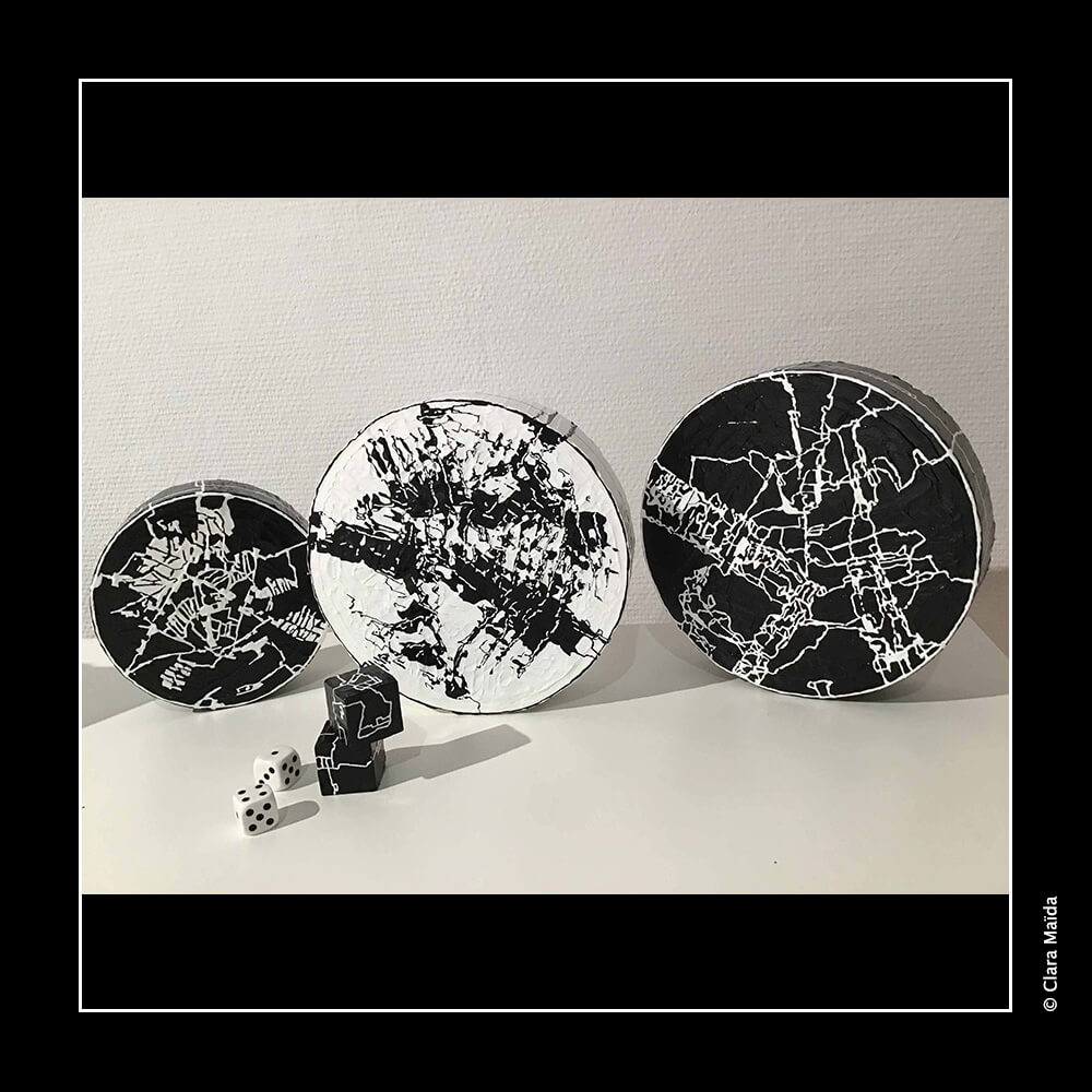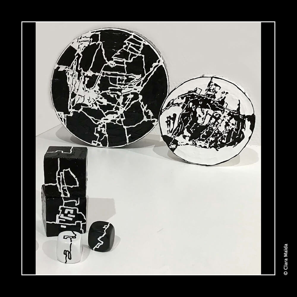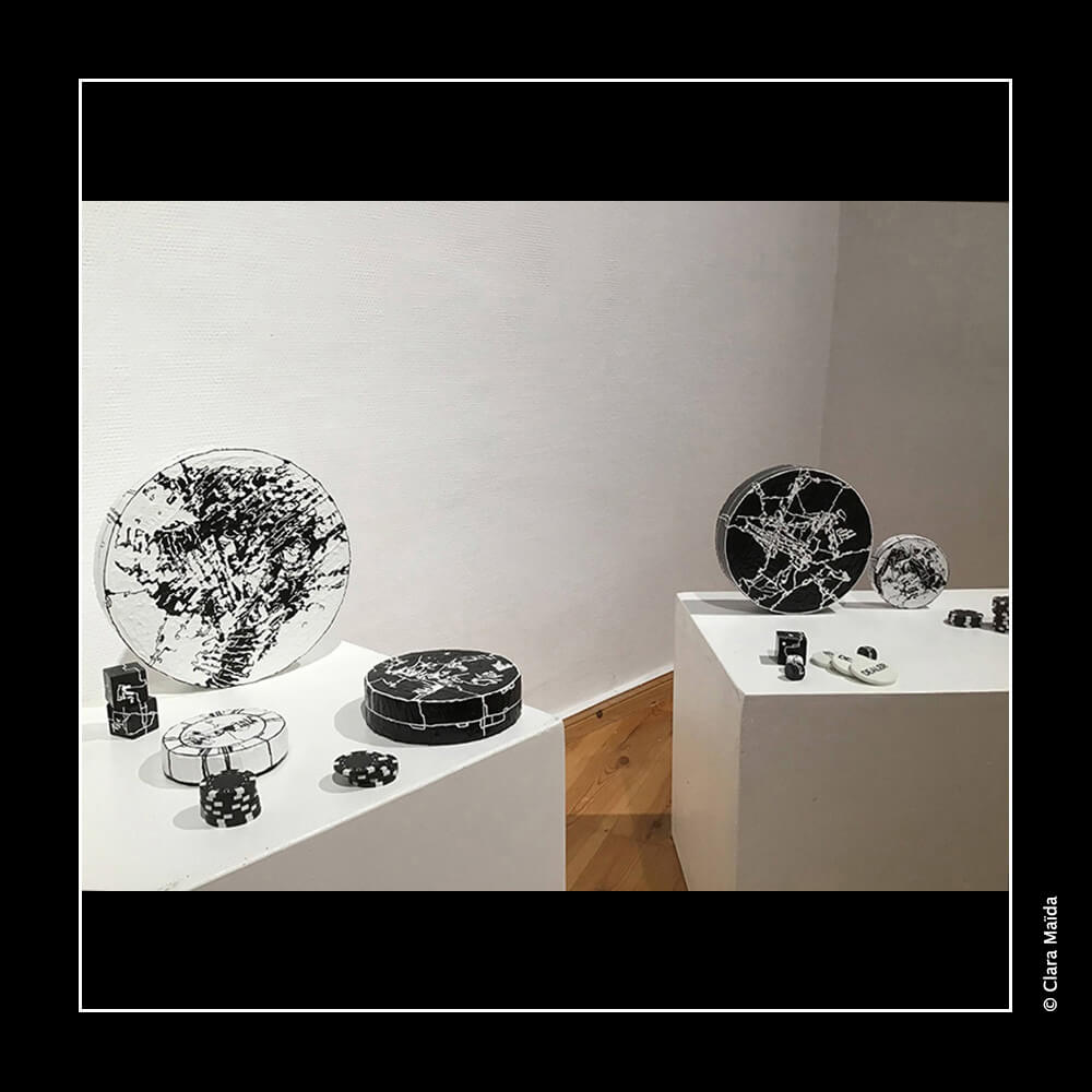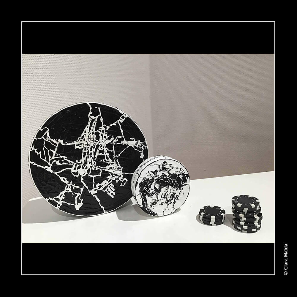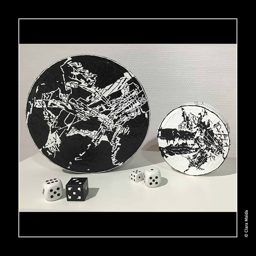 Gesso ; peintures acryliques (noire, blanche) ; couteaux à peindre et pinceaux ; marqueurs acryliques (blanc, noir) ; triptyque de peintures (3 toiles en coton : 50x100 cm) ; objets fabriqués : 34 disques de polystyrène peints (diamètre variant entre 10cm et 25cm) ; 20 petits cubes en bois peints ; environ 20 petits jetons en plastique blanc décorés ; 10 mini dés à jouer décorés ; mallette de poker en métal noir avec jetons et dés à jouer ; vidéo d'animation de 9'20 (dessin numérique) avec musique, projetée en boucle sur un écran ou un mur blanc (1980x1020 px).