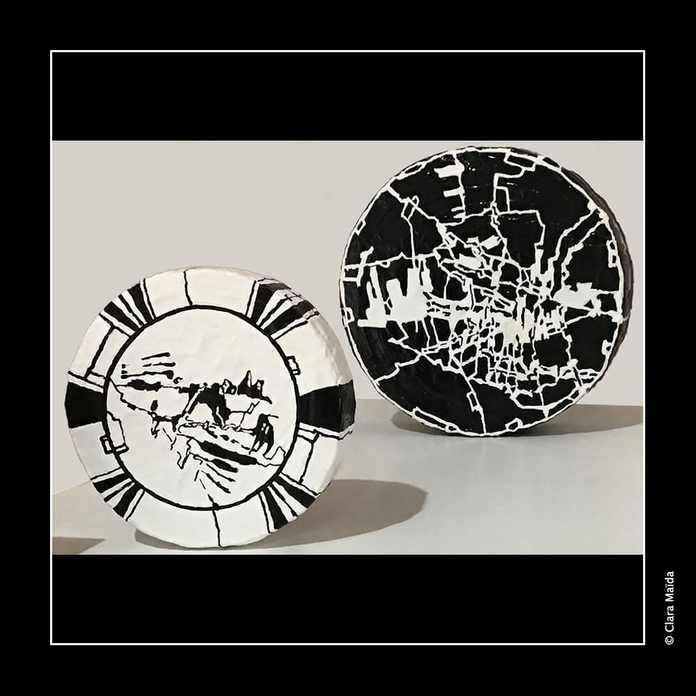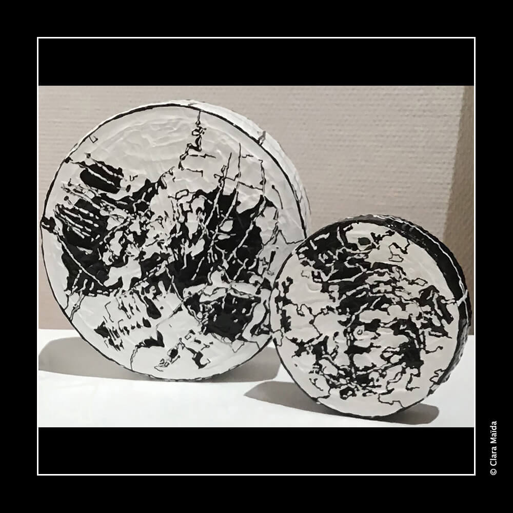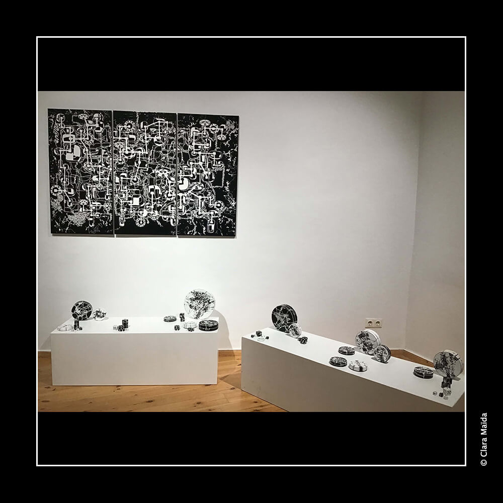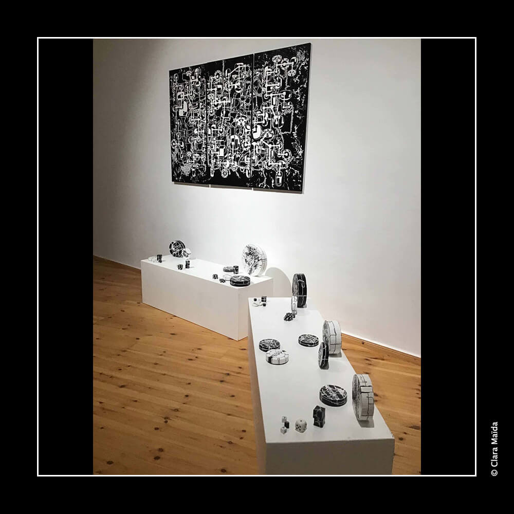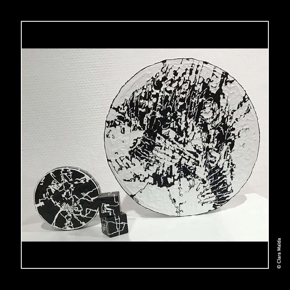 Gesso ; peintures acryliques (noire, blanche) ; couteaux à peindre et pinceaux ; marqueurs acryliques (blanc, noir) ; triptyque de peintures (3 toiles en coton : 50x100 cm) ; objets fabriqués : 34 disques de polystyrène peints (diamètre variant entre 10cm et 25cm) ; 20 petits cubes en bois peints ; environ 20 petits jetons en plastique blanc décorés ; 10 mini dés à jouer décorés ; mallette de poker en métal noir avec jetons et dés à jouer ; vidéo d'animation de 9'20 (dessin numérique) avec musique, projetée en boucle sur un écran ou un mur blanc (1980x1020 px).