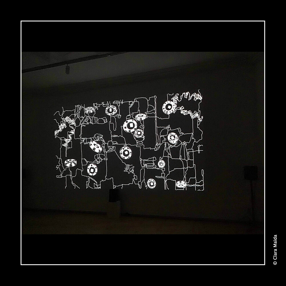 Alors que l'installation Lostery 2 comprenait des éléments visuels et des objets en relation avec la loterie, Lostery 3 se réfère au poker. La machinerie abstraite animée projetée sur un écran est composée de motifs graphiques imbriqués qui évoquent un circuit complexe en mouvement. Comme dans l'installation précédente, ce contrepoint visuel à la mécanique sonore de la pièce propose un système binaire, mais cette fois-ci avec des motifs blancs sur fond noir au lieu de motifs noirs sur fond blanc. Ces jeux de hasard et d'argent nous placent dans une position de gagner (« jackpot ») ou de perdre (« jack shit », « rien » en argot). C'est quitte ou double, tout ou rien.
