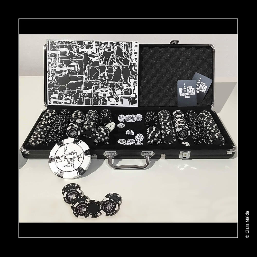 Dérivés d'objets réels (une mallette de poker avec des dés et des jetons), les objets fabriqués (disques peints de différentes dimensions, petits cubes en bois peints) semblent proliférer dans l'espace et envahir la salle, reflétant ainsi les gestes et l'état d'esprit fiévreux et obsessionnel des joueurs immergés dans le jeu.