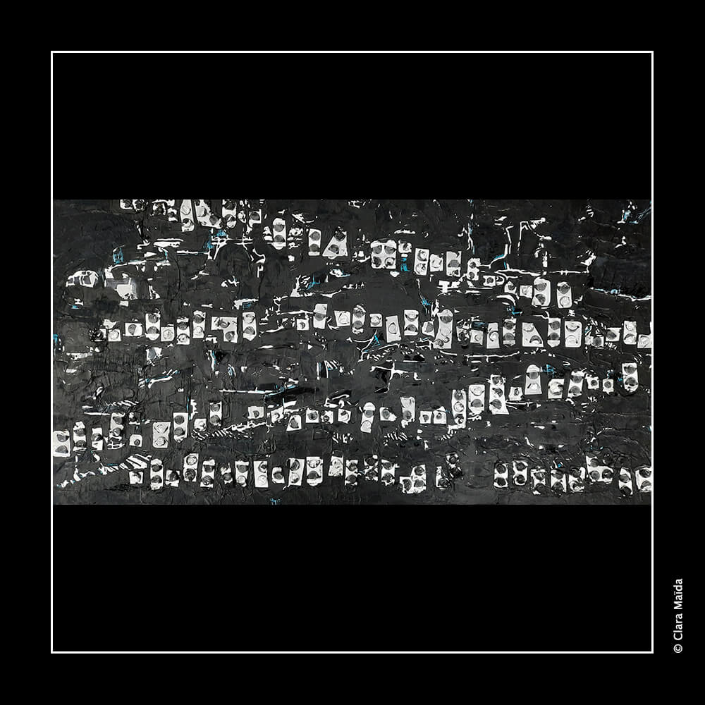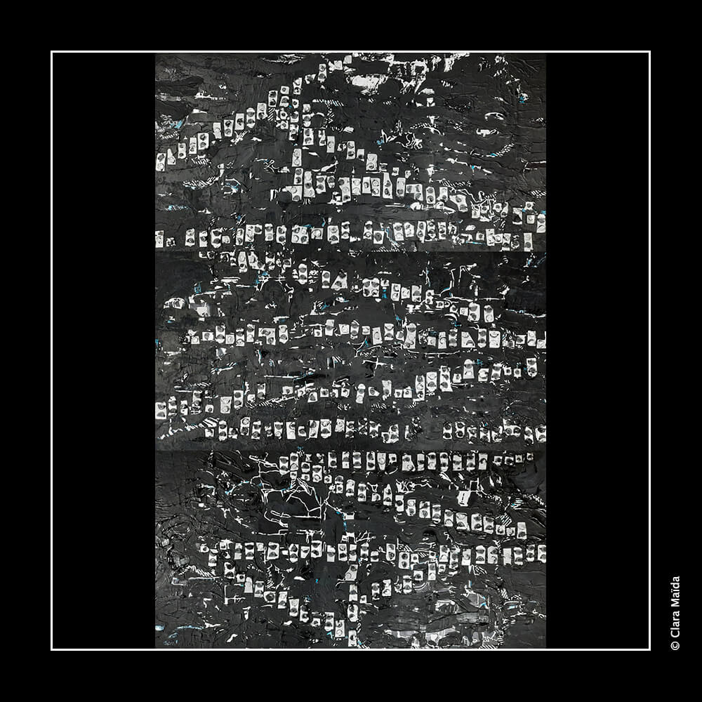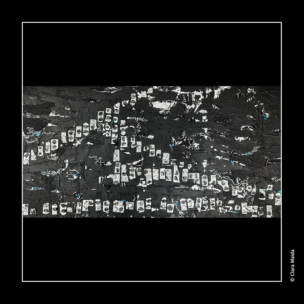 Gesso blanc ; Gesso noir ; peintures acryliques (blanc, noir, turquoise) ; pouring medium ; divers couteaux à peindre ; collage de blisters de médicaments en aluminium ; toiles coton (100x50cm x 3).