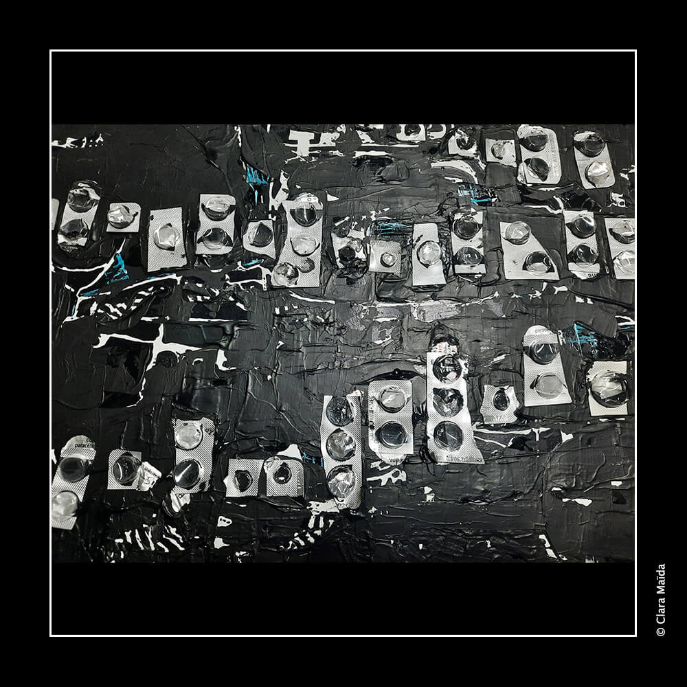 La prolifération de blisters sur chaque toile suggère cet abus en traçant des trajets qui prennent possession de l’espace pictural. Une cartographie de lignes argentées surgit du fond dont la texture sombre et épaisse évoque le goudron et nous rappelle qu’au-delà de la pollution potentielle du corps causée par un abus médicamenteux, l’accumulation des emballages ainsi que les nombreux résidus chimiques dans les eaux usées produisent une pollution environnementale supplémentaire, une autre sorte de maladie.