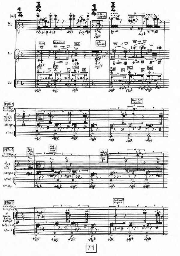 Effectif instrumental : clarinette, basson, violoncelle, 3 percussions et électronique (6 canaux).