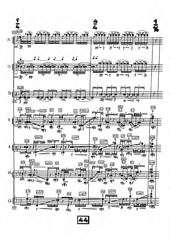 Effectif instrumental : flûte, clarinette, trombone, violon, alto, violoncelle, contrebasse et électronique (8 canaux).
