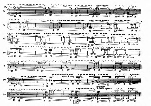 Effectif instrumental : 7 chanteurs amplifiés, avec résonateurs et objets percussifs additionnels.