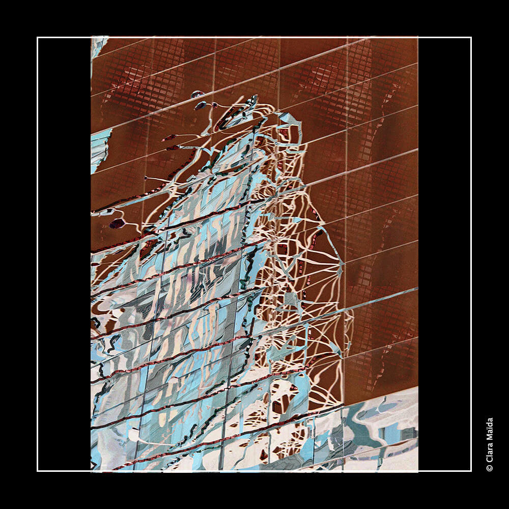 Photographie : Clara Maïda (New York, 2012) ; reflet de câbles métalliques sur les vitres d'un gratte-ciel en verre ; retouche numérique avec Photoshop (inversion en négatif, colorisation et filtres, incrustation des fragments d'une autre photographie sur les vitres).